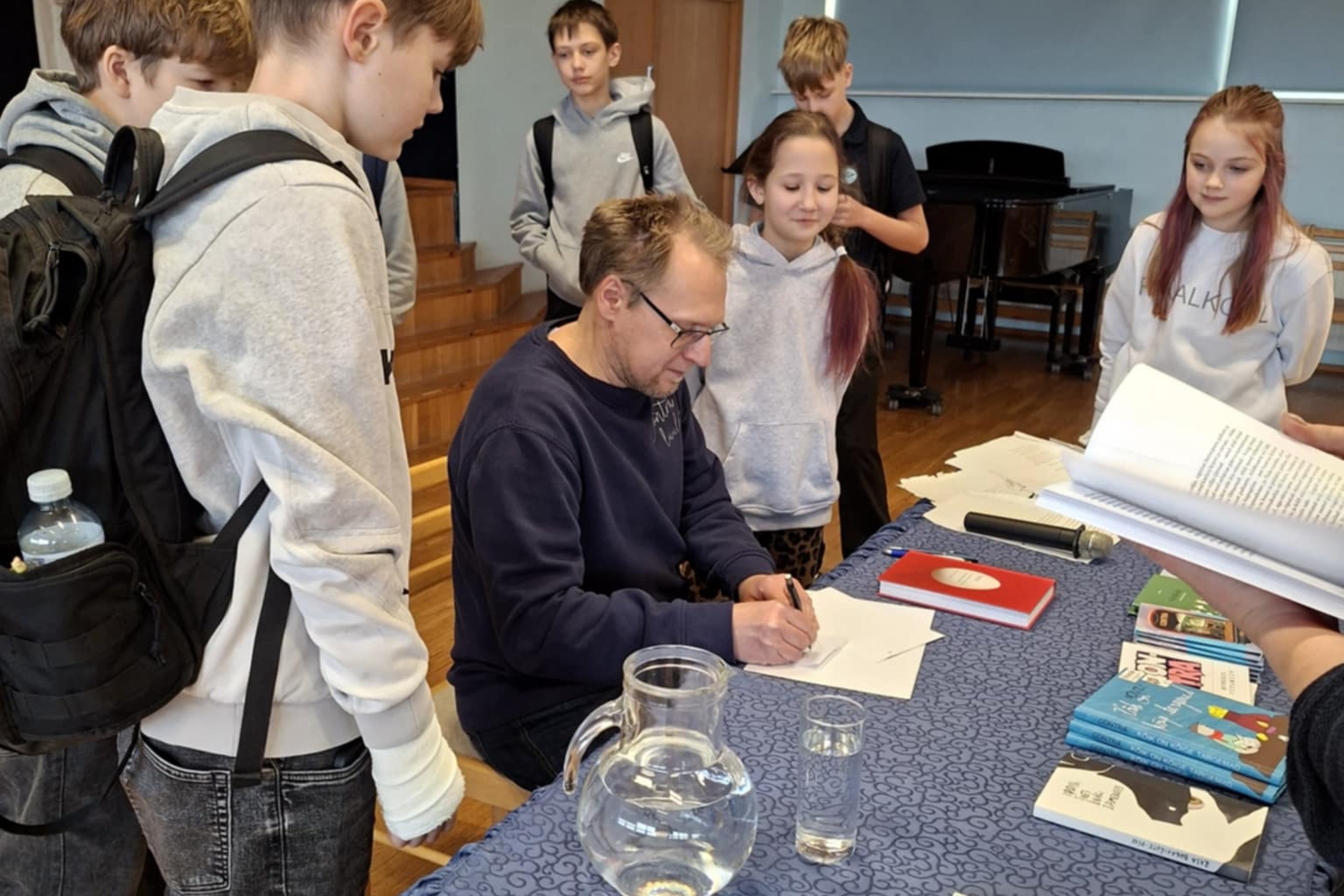 Õpilased ja õpetajad said kuulda humoorikaid luuletusi eesti, võru ja läti keeles. Kirjanik tutvustas oma raamatuid ning rääkis tõlkija tööst. Õpilased said Contrale esitada küsimusi ja need olid arvukad ning mitmekesised. Kirjanik kiitis meie kooli sööki ning meenutas oma lapsepõlve maitseid. Juttu tuli kirjaniku enda kooliajast ning põnevatest juhtumistest, mis teda eluteel mõjutanud on.